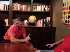 Inked gaydaddy bareback fucks skinny twink in office
