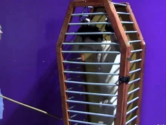 Skinny twink Merlin bound and flogged in a coffin cage